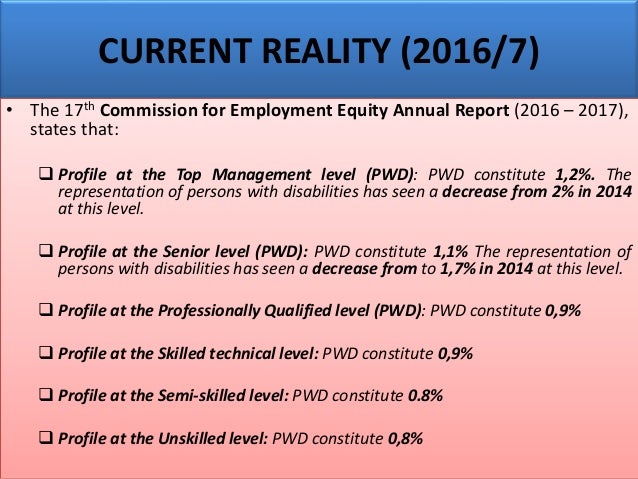 Employers must report to the Department of Labour on the implementation of the plan in order for. Some people with disabilities have one or more disabilities. Purposes of this research brief are PEPUDA and the Employment Equity Act 55 of 1998 EEA.